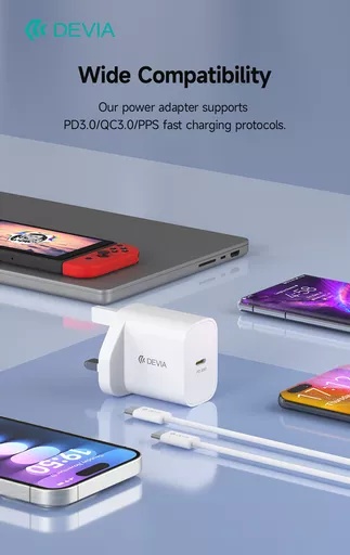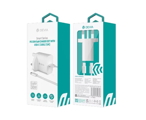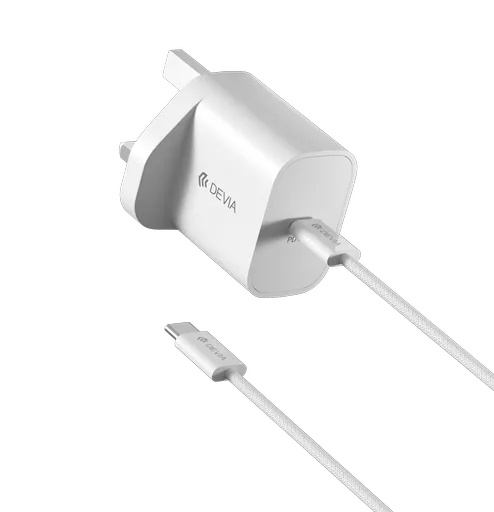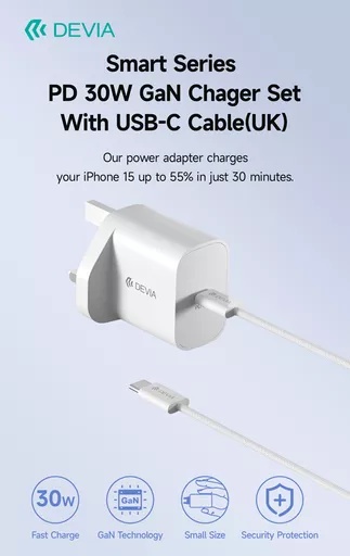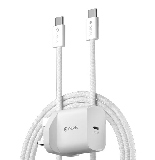 Devia – 30W GaN USB-C 3-Pin UK Charging Plug & 1.2m USB-C to USB-C Cable – White